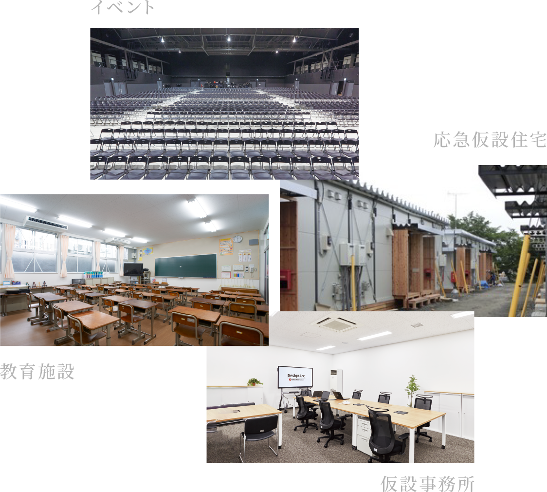 デザインアークはこれまで数多くの建設現場において、仮設事務所内の環境づくりを手掛け、全国のゼネコン、サブコン、代理店の皆様との信頼関係を築いてきました。事務機器から空調機器にいたるまで、ここで培ったノウハウは、教育施設やイベントなどその他の現場にも活かされ、様々なシーンの最適な環境づくりをサポートしています。